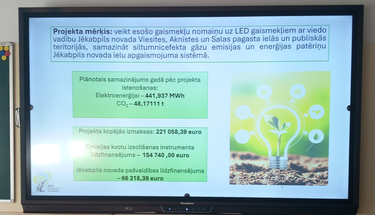 Lai veicinātu skolnieku izpratni par projekta īstenošanas laikā sasniegto enerģijas ietaupījumu un CO2 emisijas samazinājumu, šī gada 3.un 4.aprīlī Jēkabpils novada pašvaldības darbinieki informēja Viesītes vidusskolas un Aknīstes vidusskolas 9.un 11.klašu skolniekus par projekta aktivitātēm un projekta rezultātiem.