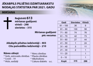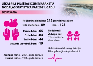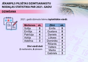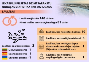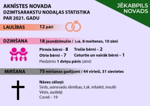 Jēkabpils novada Dzimtsarakstu nodaļas vadītāja Kristīne Gumbele ir apkopojusi statistiku par 2021. gadu Jēkabpils pilsētas, Aknīstes novada, Jēkabpils novada, Krustpils novada, Salas novada un Viesītes novada Dzimtsarakstu nodaļās.