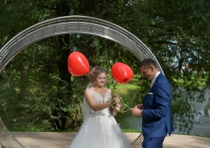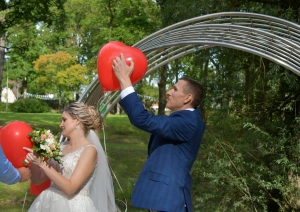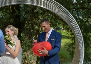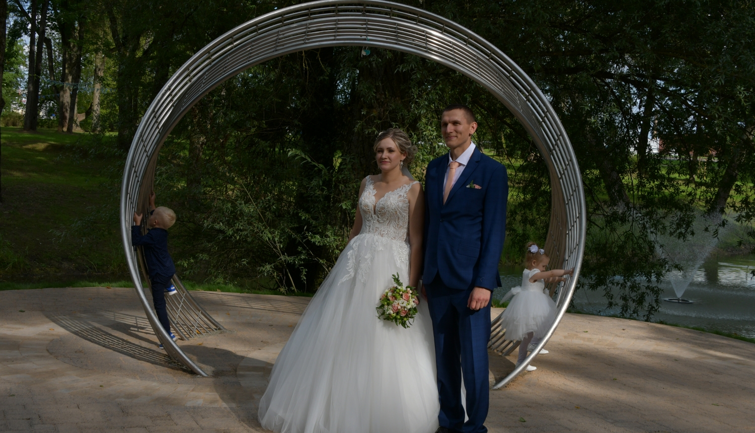 Svinīgajā vides objekta atklāšanas pasākumā piedalījās jaunlaulātie – Aleksejs un Jana.
