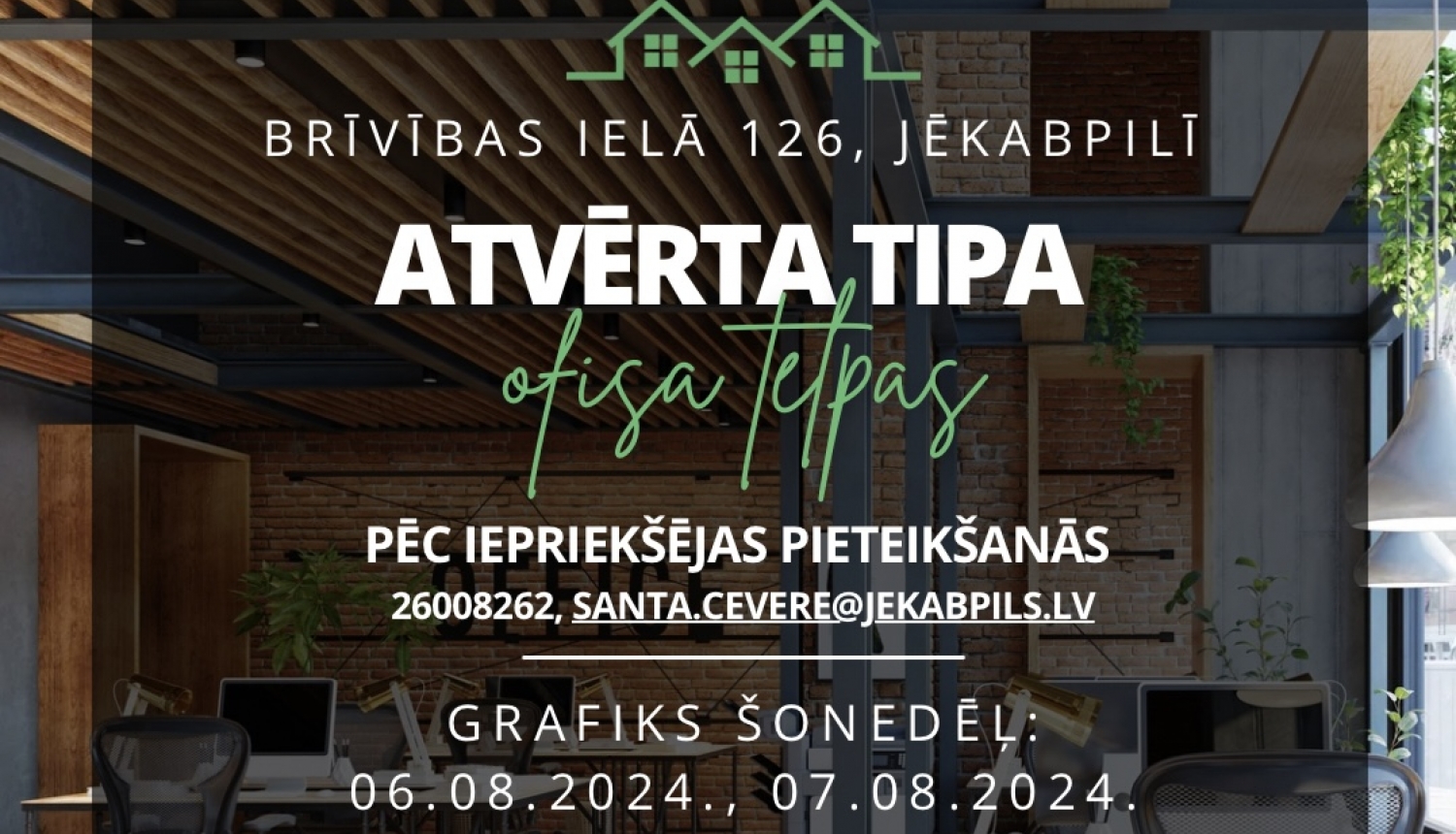 Šonedēļ “kopstrādes telpas” pieejamas 6. un 7. augustā. Lai izmantotu telpas, ir nepieciešama iepriekšēja pieteikšanās, sazinoties ar Jēkabpils novada pašvaldības referenti NVO darba un uzņēmējdarbības atbalsta jautājumos Santu Čeveri (santa.cevere@jekabpils.lv, +371 26008262).