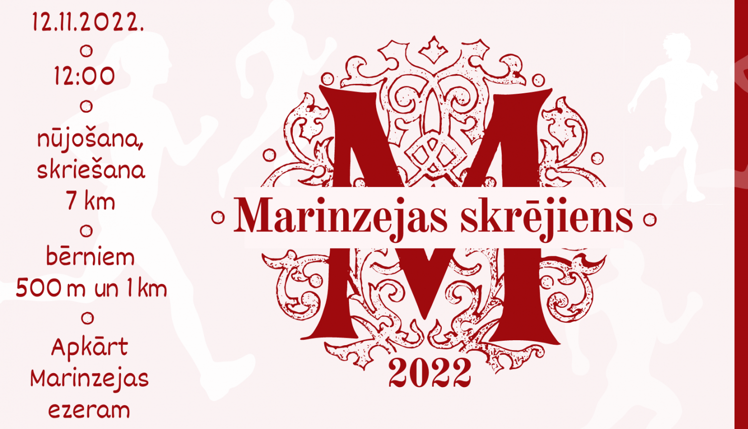 Laiks jaunām tradīcijām Jēkabpils novadā! Par godu Lāčplēša dienai sestdien, 12. novembrī, plkst. 12.00 Atašienē, gleznainajos Marinzejas ezera krastos norisināsies “Marinzejas skrējiens 2022”. Bērni aicināti doties 500 m un vienu kilometru garās distancēs, bet pieaugušajiem skrienot vai nūjojot būs jāmēro septiņus kilometrus gara trase apkārt ezeram.