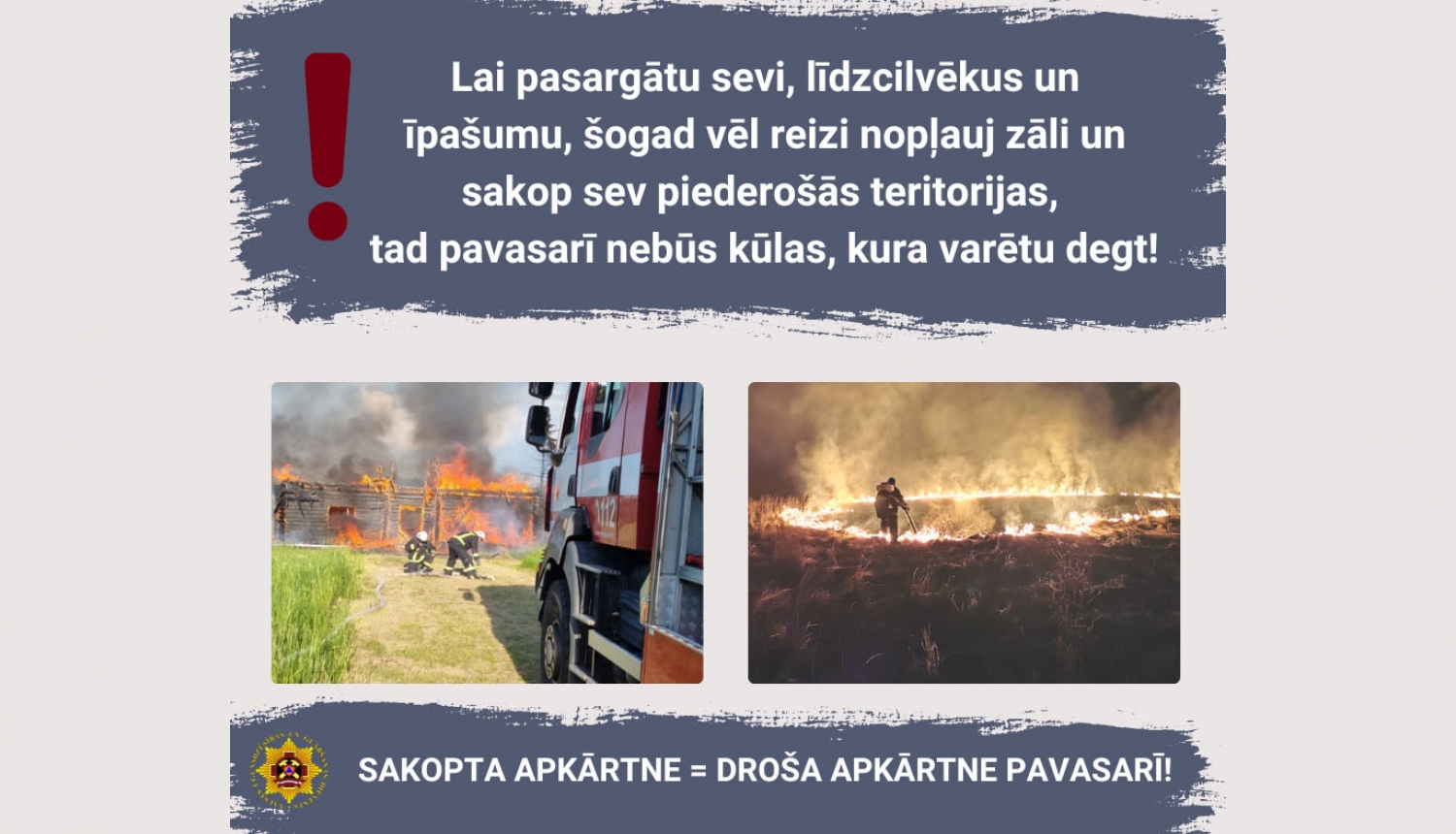 Lai pasargātu sevi, līdzcilvēkus un īpašumus, Valsts ugunsdzēsības un glābšanas dienests (VUGD) aicina iedzīvotājus un pašvaldības šogad vēl reizi nopļaut zāli un sakopt sev piederošās teritorijas, lai pavasarī nebūtu kūlas, kura varētu degt! Katru pavasari ugunsdzēsēji glābēji ik dienas steidzas dzēst kūlas ugunsgrēkus, kuros ne tikai nodeg vairāki tūkstoši hektāru Latvijas teritorijas, bet arī cieš un pat iet bojā cilvēki.