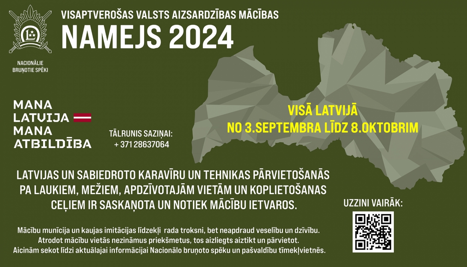 No 3. septembra līdz 8. oktobrim visā Latvijā notiks Nacionālo bruņoto spēku organizētās visaptverošas valsts aizsardzības mācības “Namejs 2024”.