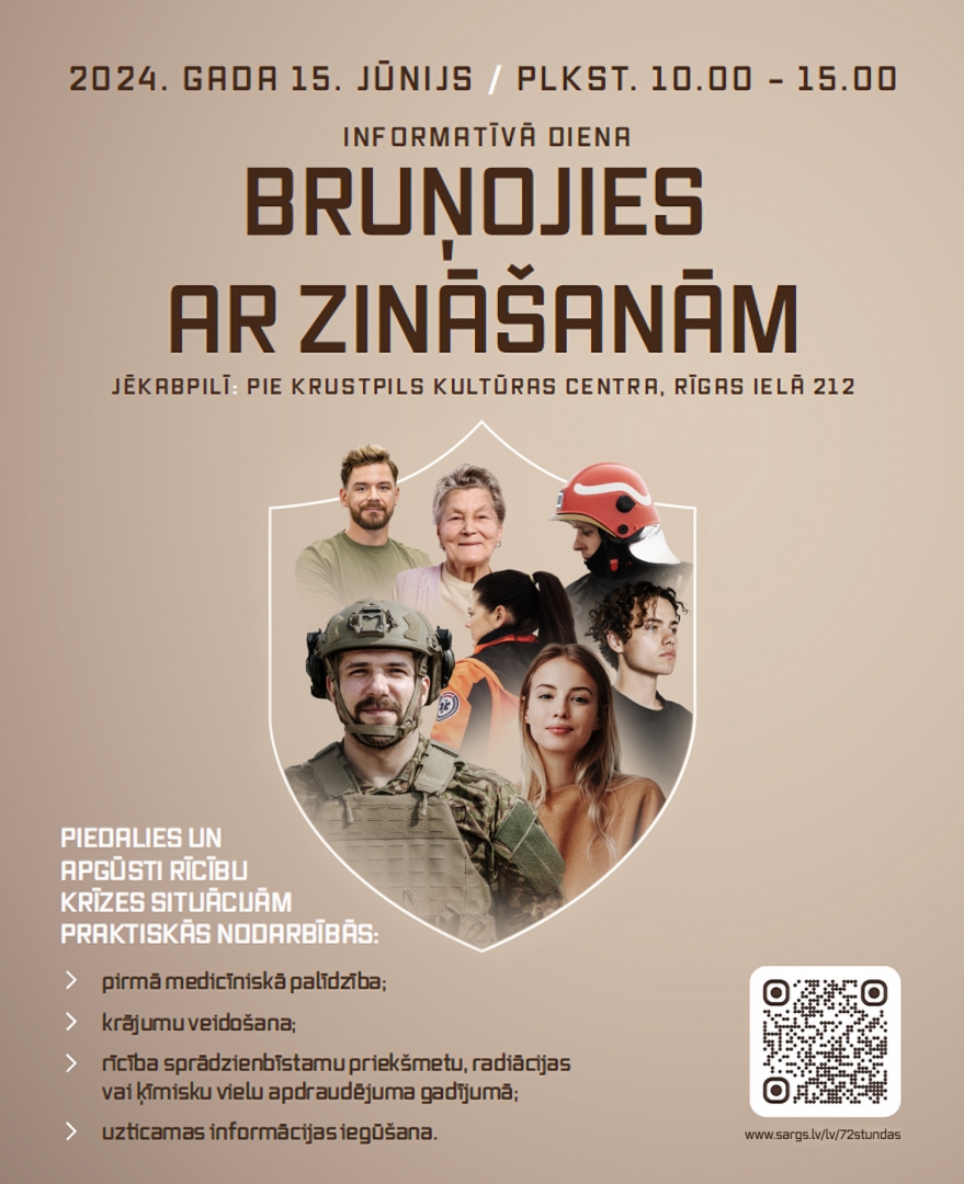 15. jūnijā no pulksten 10.00 līdz 15.00 četrpadsmit Latvijas pilsētās – Rīgā, Bauskā, Jūrmalā, Ogrē, Valmierā, Balvos, Gulbenē, Rēzeknē, Daugavpilī, Jēkabpilī, Jelgavā, Liepājā, Ventspilī un Kuldīgā – notiks informatīvā diena “Bruņojies ar zināšanām”, kurā ikviens iedzīvotājs varēs apgūt rīcību krīzes situācijām praktiskās nodarbībās.