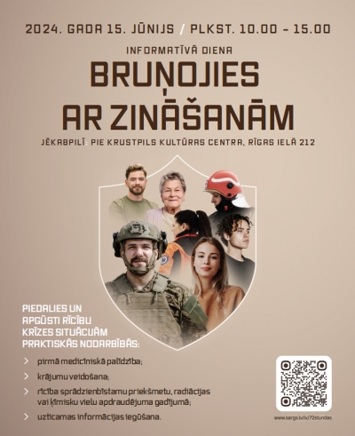 Dodoties uz pasākumu, iedzīvotāji aicināti arī iepazīties ar materiāliem ziņu portāla “Sargs.lv” sadaļā “72 stundas”, kur līdzās bukleta “Kā rīkoties krīzes gadījumā” jaunākajai redakcijai pieejama arī rokasgrāmata “Kā rīkoties kara gadījumā”, kas tapusi, mācoties no Ukrainas pieredzes cīņā pret Krievijas okupācijas armiju: www.sargs.lv/lv/72stundas-