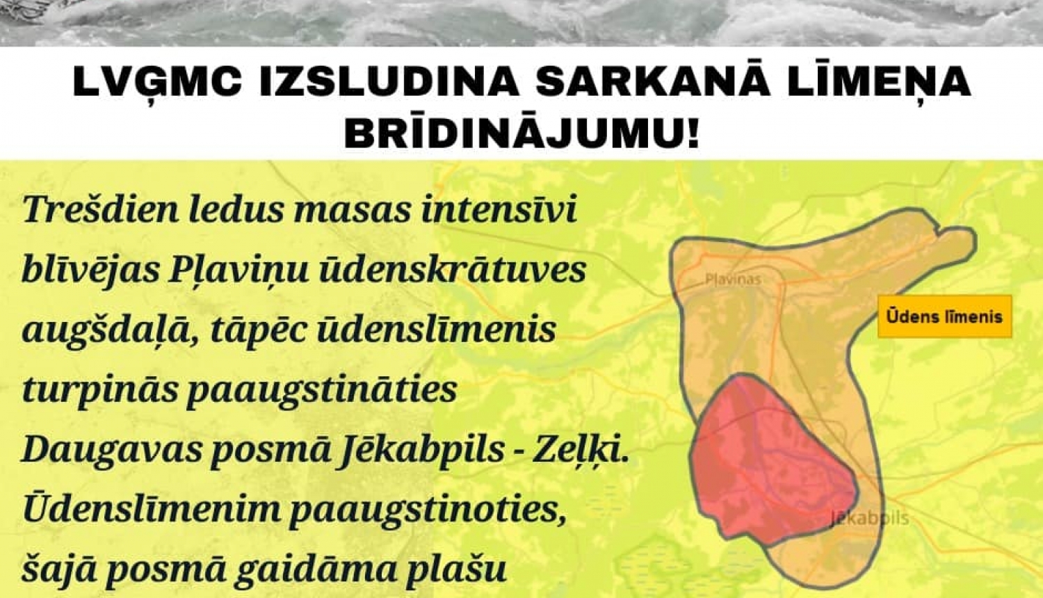 Sarkanais brīdinājums izsludināts, jo trešdien ledus masas intensīvi blīvējas Pļaviņu ūdenskrātuves augšdaļā, tāpēc ūdenslīmenis turpinās paaugstināties Daugavas posmā Jēkabpils - Zeļķi. Ūdenslīmenim paaugstinoties, šajā posmā gaidāma plašu teritoriju applūšana.