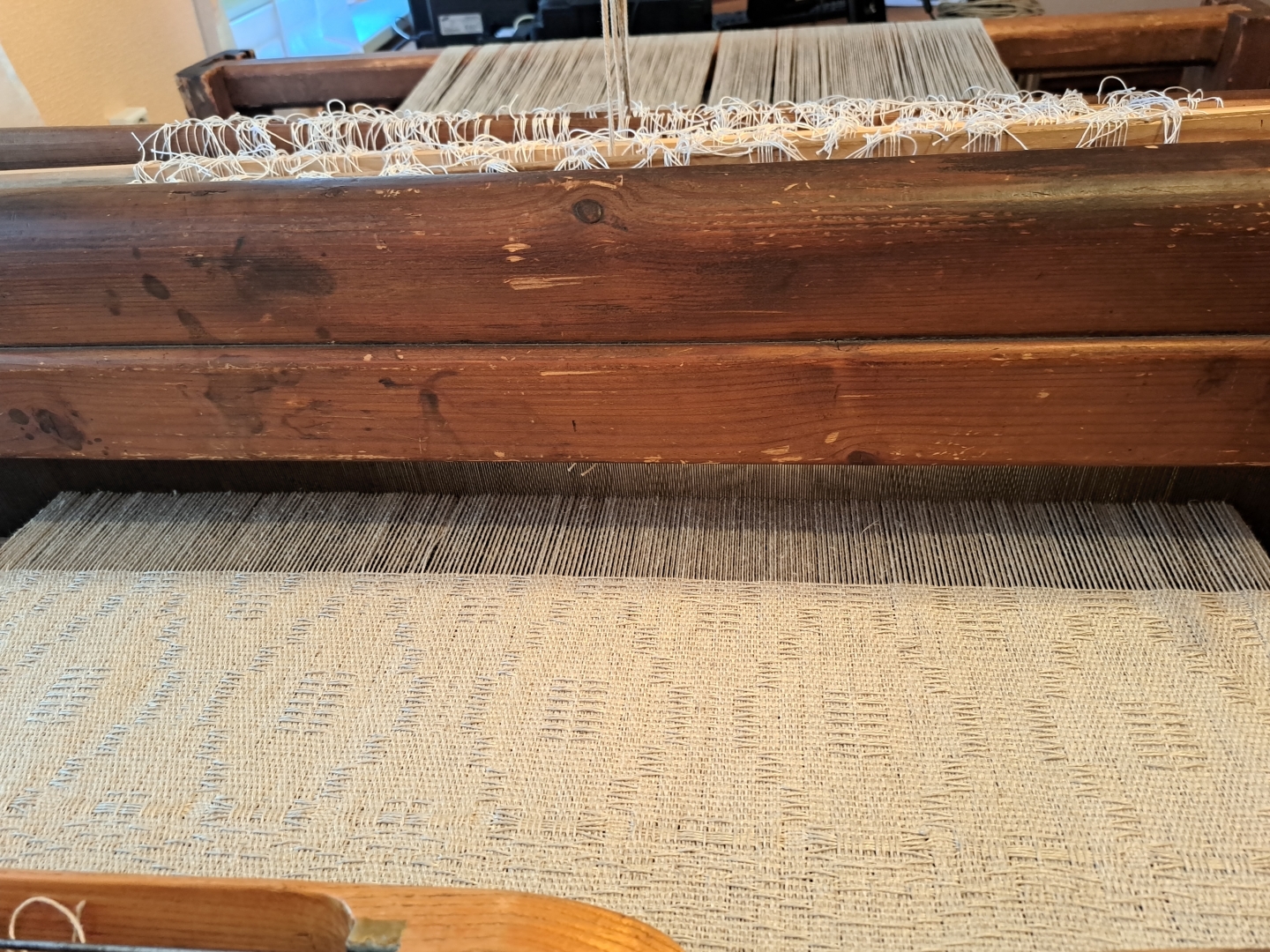 Linu galdauts vēl top, jo no sākuma ar Baibu Biti ievilkām dažādus diegus stellēs un pamēģinājām rakstus, kādus vēlētos aust. Mūsu pulciņam piebiedrojās un palīdzēja arī Natālija no Zasas. Galdauta auduma platums ir 60 cm un jānoauž 6m, lai izveidotu 3m garu un 1,20 m platu galdautu mūsu saimes istabas galdam.