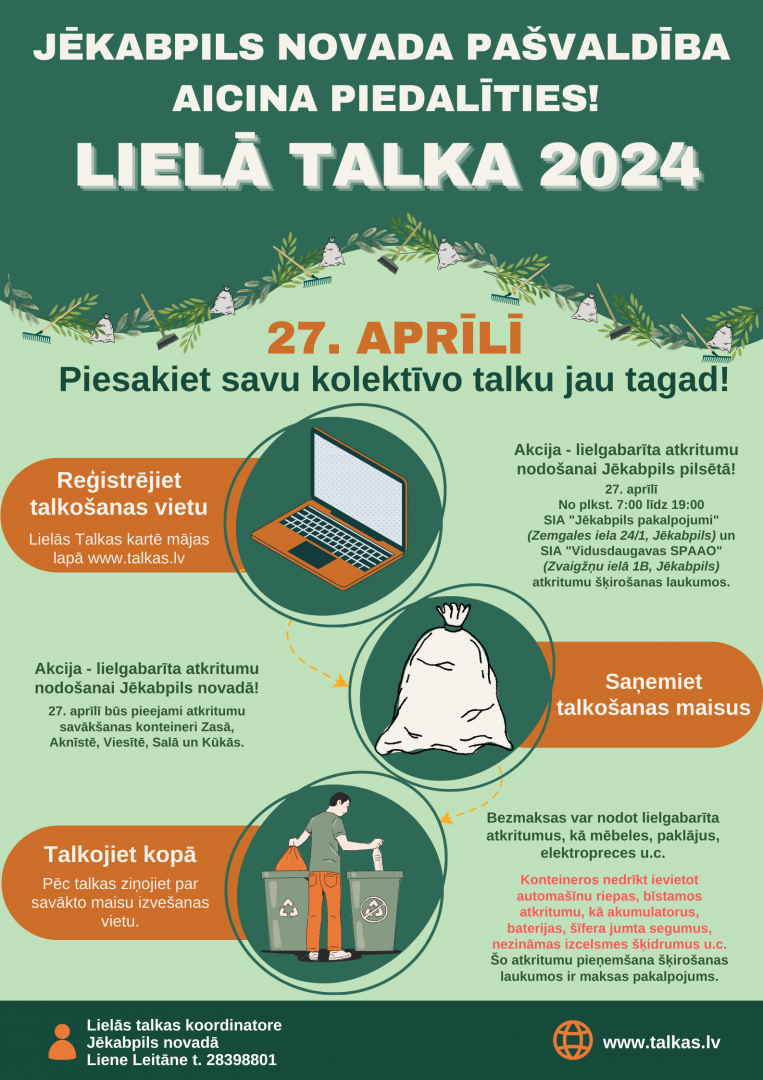 Lielā talka 2024 norisināsies 27. aprīlī visā Latvijā. Arī Jēkabpils novada pašvaldība aicina iesaistīties un sakopt kādu vietu Jēkabpils novadā.