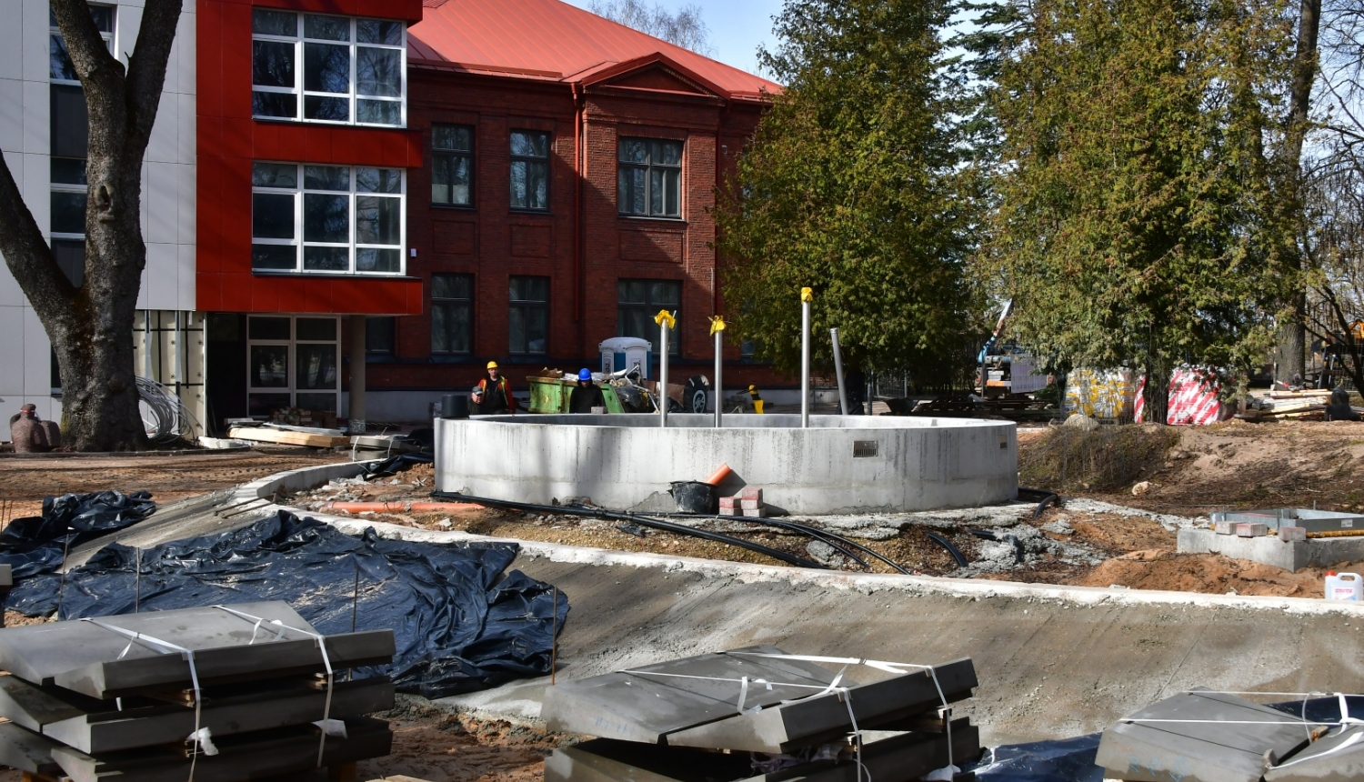 Iestājoties pavasarim, atsākti arī teritorijas labiekārtošanas darbi pie Jēkabpils valsts ģimnāzijas – tiek bruģēti laukumi un montēti betona pakāpieni pie strūklakas. Tuvākajās nedēļās plānots uzstādīt strūklakas dekoratīvos elementus.