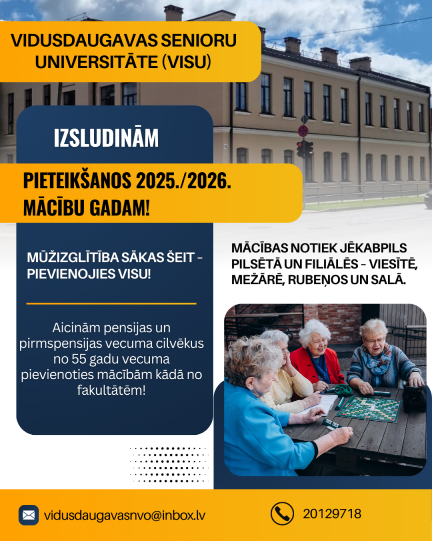 Vidusdaugavas Senioru Universitāte (VISU) izsludina pieteikšanos 2025./2026. mācību gadam!