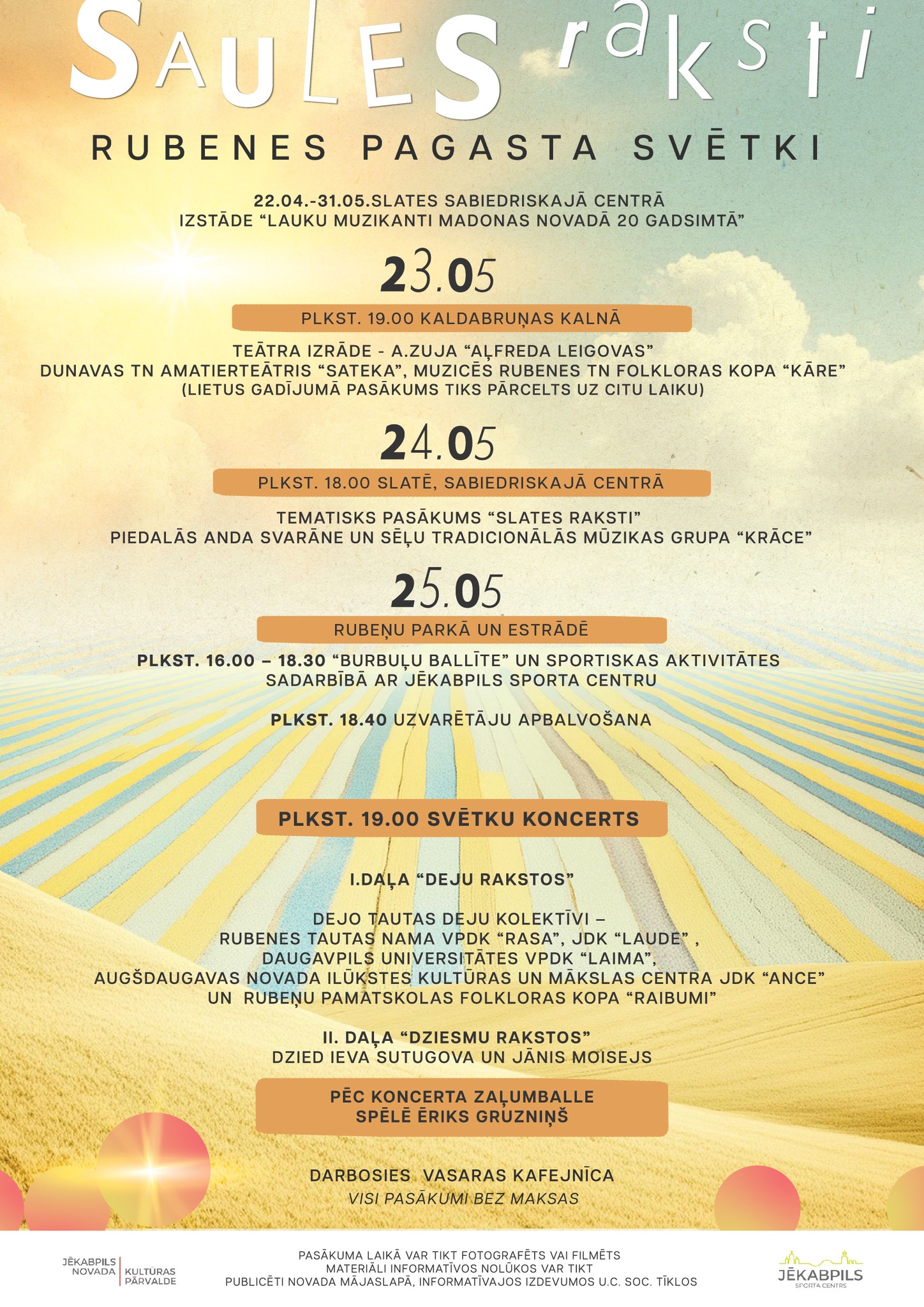 25.maijā no plkst.16.00 svētku noslēguma diena Rubeņu parkā un estrādē. “Burbuļu ballīte” bērniem un jautras, sportiskas aktivitātes bērniem, pieaugušajiem un ģimenēm sadarbībā ar Jēkabpils sporta centru. Plkst. 18.40 uzvarētāju apbalvošana. Plkst.19.00 Svētku koncerts. Piedalīsies tautas deju kolektīvi, Rubeņu pamatskolas un PII audzēkņi. Koncerta otrajā daļā uzstāsies dziedātāji - Ieva Sutugova un Jānis Moisejs. Noslēgumā “Zaļumballe”, kurā spēlēs Ēriks Gruzniņš. Svinēsim svētkus kopā! Laipni gaidīti Rubenes pagastā!