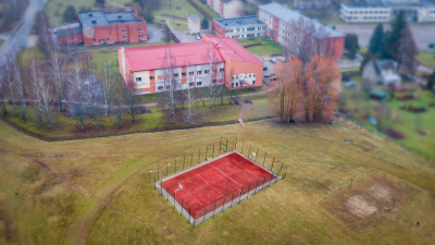 - Basketbola laukums (17 x 30 m) ar sintētisko segumu un stacionāriem groziem;
