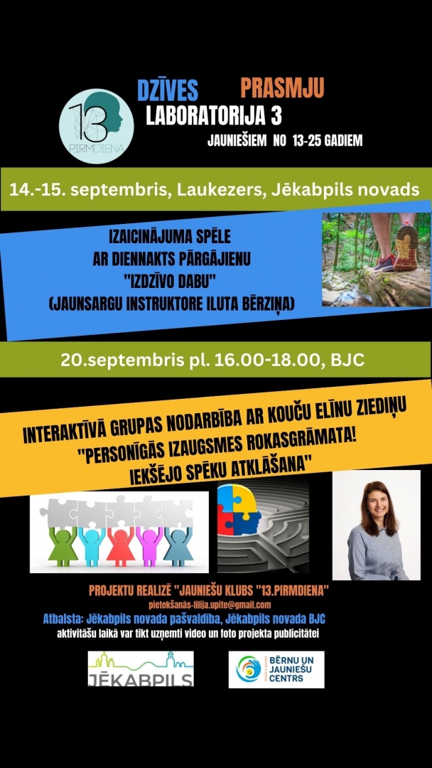 Biedrība “Jauniešu klubs “13.pirmdiena”” turpina realizēt projektu “Dzīves prasmju laboratorija 3”. Projekta aktivitātes sākas jūlija mēnesī ar mērķi - pielietojot neformālās izglītības metodes, piedāvāt jauniešiem apgūt jaunas zināšanas prasmēm, kas stiprinātu viņu garīgo un fizisko veselību, uzlabotu dzīves kvalitāti, stiprinātu pašvērtējumu un pārliecību par sevi un savām nākotnes iespējām, veicinātu grūtāk aktivizējamu jauniešu iekļaušanu sabiedrībā un līdzdalības veicināšanu vietējās norisēs, parādot resursus brīvā laika pavadīšanas dažādošanai un vides izglītošanai. Uz katru nodarbību plānots sniegt iespēju piedalīties 15 jauniešiem, tādēļ vietu skaits būs ierobežots. (izņemot ekskursiju). Pieteikšanās: rakstot uz e-pastu: lilija.upite@gmail.com.