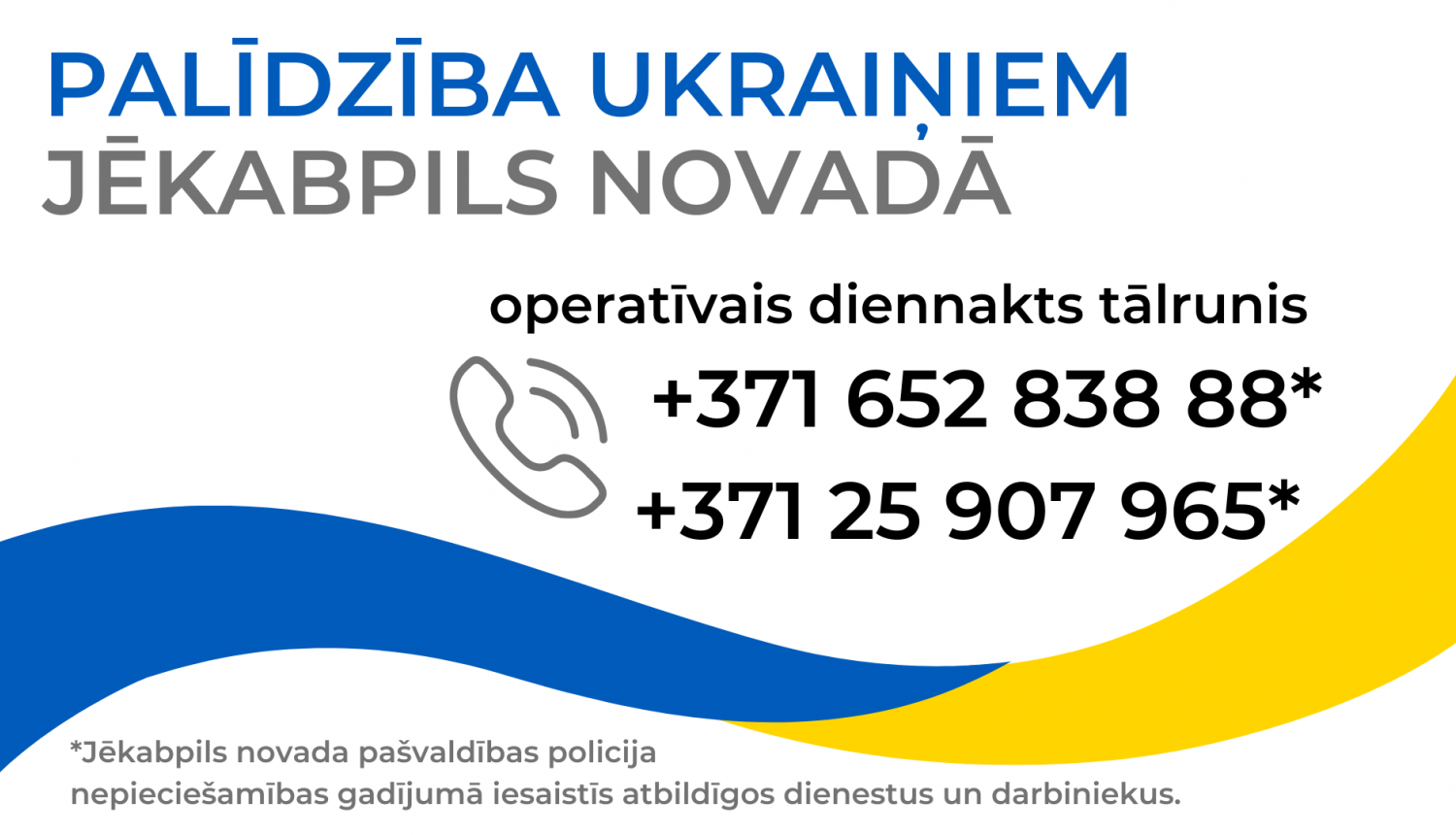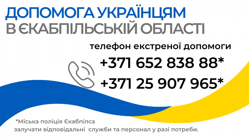 Муніципалітет Єкабпілса повідомляє - міська поліція цілодобово приймає дзвінки про допомогу мирному населенню України за телефоном +371 65283888; +371 25 907 965.