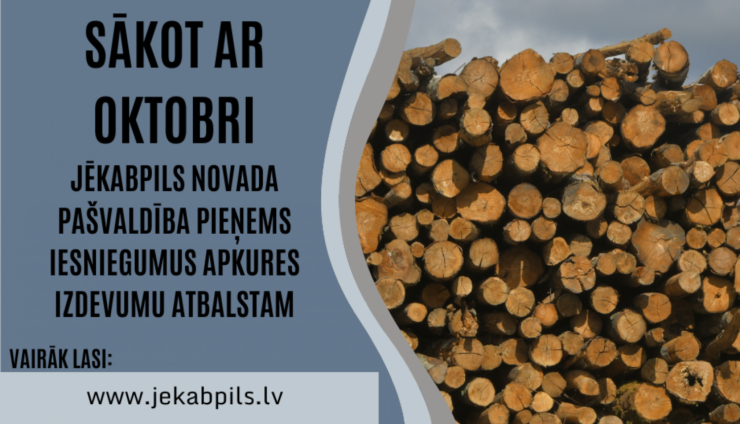No 3. oktobra Jēkabpils novada pašvaldība sāks pieņemt iesniegumus par atbalstu energoresursu cenu pieauguma kompensēšanai mājsaimniecībām, kas apkurē izmanto malku, granulas vai briketes, kā arī no 1. oktobra elektroniski portālā www.epakalpojumi.lv. No 1. novembra - mājsaimniecībām, kas apkurē izmanto elektroenerģiju.