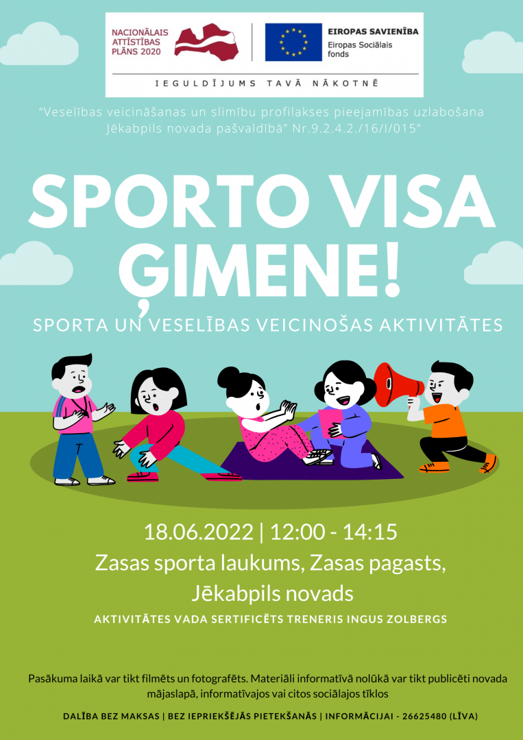 Sestdien, 2022.gada 18.jūnijā no pl. 12:00 līdz pl. 14:15 Zasas ciema sporta laukumā tiks organizētas sportiskas, saliedējošas aktivitātes ģimenēm ar bērniem. Pasākums “Sporto visa ģimene” tiek organizēts projekta Nr.9.2.4.2./16/I/15 “Veselības veicināšanas un slimību profilakses pieejamības uzlabošana Jēkabpils novada pašvaldībā” ietvaros.