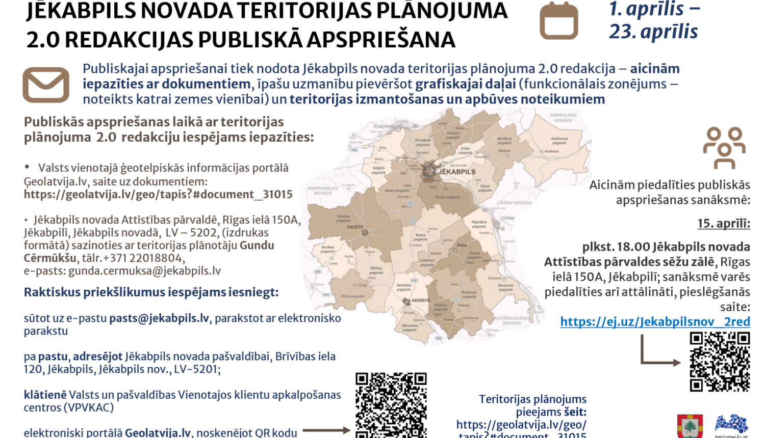 Publiskās apspriešanas sanāksme notiks 2025. gada 15. aprīlī, pulksten 18:00 - hibrīdrežīmā (klātienē un attālināti) Jēkabpils novada Attīstības pārvaldes sēžu zālē, Rīgas ielā 150A, Jēkabpils, Jēkabpils novadā, attālināti tiešsaistes platformā Microsoft Teams - saite, lai pieslēgtos: https://ej.uz/Jekabpilsnov_2red; QR kods: