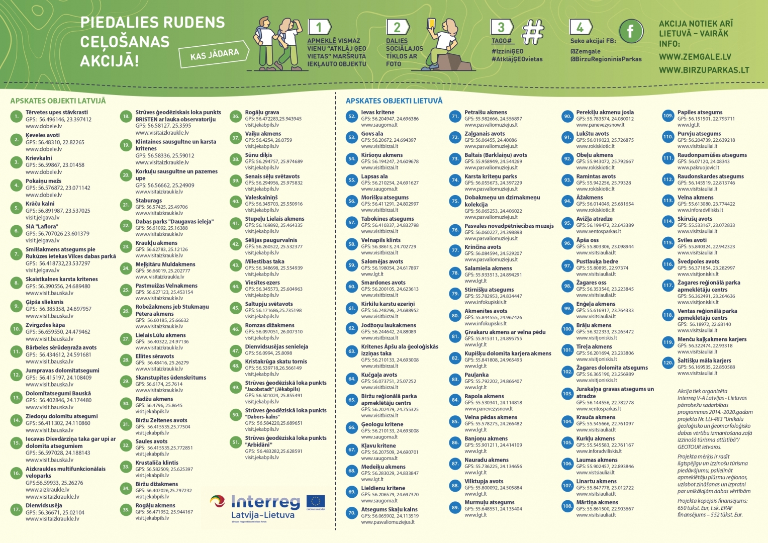 Divu mēnešu garumā no 19. septembra līdz pat 13. novembrim Zemgales plānošanas reģions un Aukštaitijas Aizsargājamo teritoriju direkcija (Biržu reģionālais parks) organizē ceļošanas akciju „Atklāj ĢEO vietas“ Zemgales un Ziemeļlietuvas ģeoloģiskajos un ģeomorfoloģiskajos tūrisma dabas objektos.