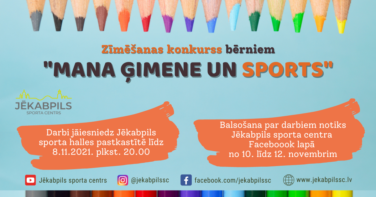 Jēkabpils sporta centrs aicina bērnus piedalīties zīmēšanas konkursā par tēmu „Mana ģimene un sports”. Visi iesniegtie darbi piedalīsies balsošanā Jēkabpils sporta centra Facebook lapā, un labāko darbu autori saņems balvas no Jēkabpils sporta centra.