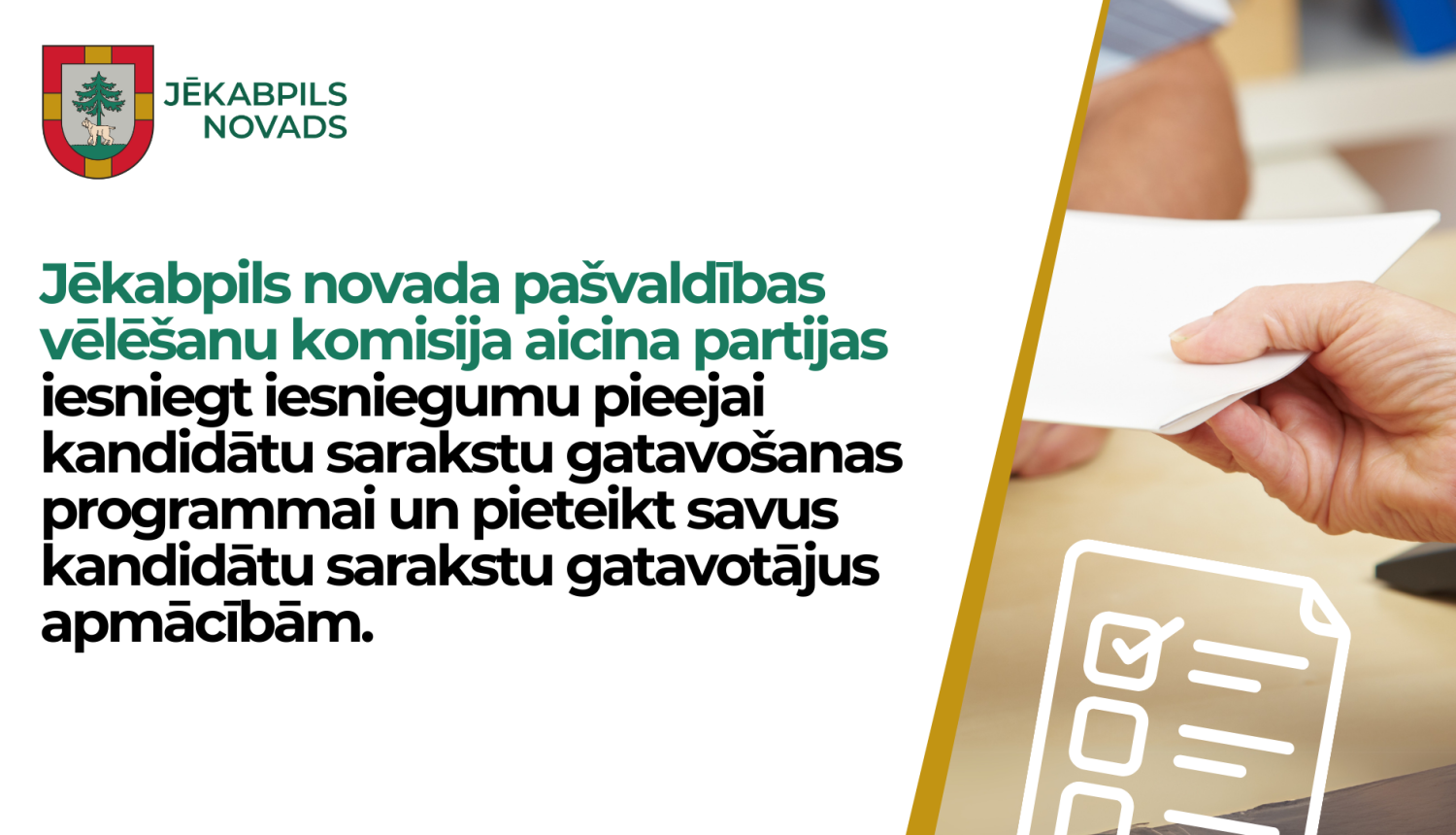 Jēkabpils novada pašvaldības vēlēšanu komisija aicina partijas iesniegt iesniegumu pieejai kandidātu sarakstu gatavošanas programmai un pieteikt savus kandidātu sarakstu gatavotājus apmācībām.