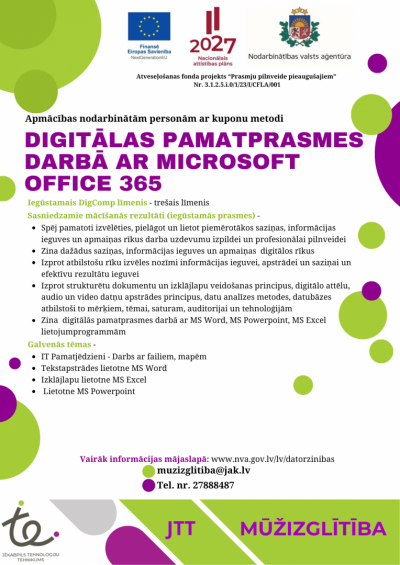 Izmanto iespēju un saņem Nodarbinātības valsts aģentūras kuponu un attālināti apgūsti DATORZINĪBAS Jēkabpils Tehnoloģiju tehnikumā (Pasta iela 1, Jēkabpils, LV-5201).