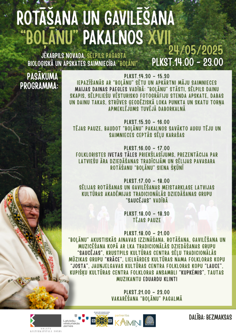 Pasākuma dalībnieki aicināti ierasties “Boļānos” jau agrā pēcpusdienā, lai māju saimnieces Maijas Dainas Paegles mīļi sagaidīti un vadīti iepazītos ar māju vēsturi, apkārtnes kultūrvēsturi un tūrisma objektiem, noklausītos folkloristes, tradicionālās āra dziedāšanas pētnieces un atdzimšanas veicinātājas Ivetas Tāles priekšlasījumu par Sēlijas pavasara rotāšanu un latviešu āra dziedāšanas tradīcijām un piedalītos Latvijas Kultūras akadēmijas Tradicionālās dziedāšanas grupas “Saucējas” vadītā rotāšanas un gavilēšanas meistarklasē. Tāpat dalībnieki aicināti muzicēt vai vienkārši klausoties baudīt muzicēšanu “Boļānu” pakalnos kopā ar Krustpils kultūras centra sēļu tradicionālās mūzikas grupu “Krāce”, Lielvārdes kultūras nama folkloras kopu “Josta”, Jaunjelgavas kultūras centra folkloras kopu “Lauce”, Kupišķu kultūras centra folkloras ansambli “Kupkėmis” un tautas muzikantu Eduardu Klinti, tādējādi radot vienreizēju un neatkārtojamu apkārtnes skanisko ainavu. Pasākuma noslēgumā gaidāma vakarēšana “Boļānu” pagalmā ar galda dziesmām, dejām un rotaļām, baudot māju saimnieces ceptās sēļu karašas, zāļu tējas un pasākuma dalībnieku līdzpaņemto cienastu.