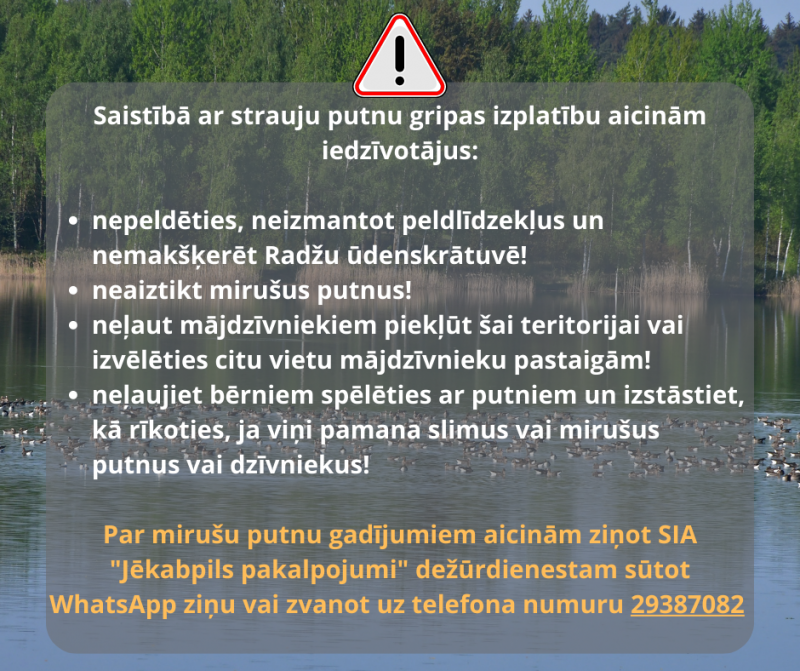 Par mirušu putnu gadījumiem aicinām ziņot SIA "Jēkabpils pakalpojumi" dežūrdienestam sūtot WhatsApp ziņu vai zvanot uz telefona numuru 29387082