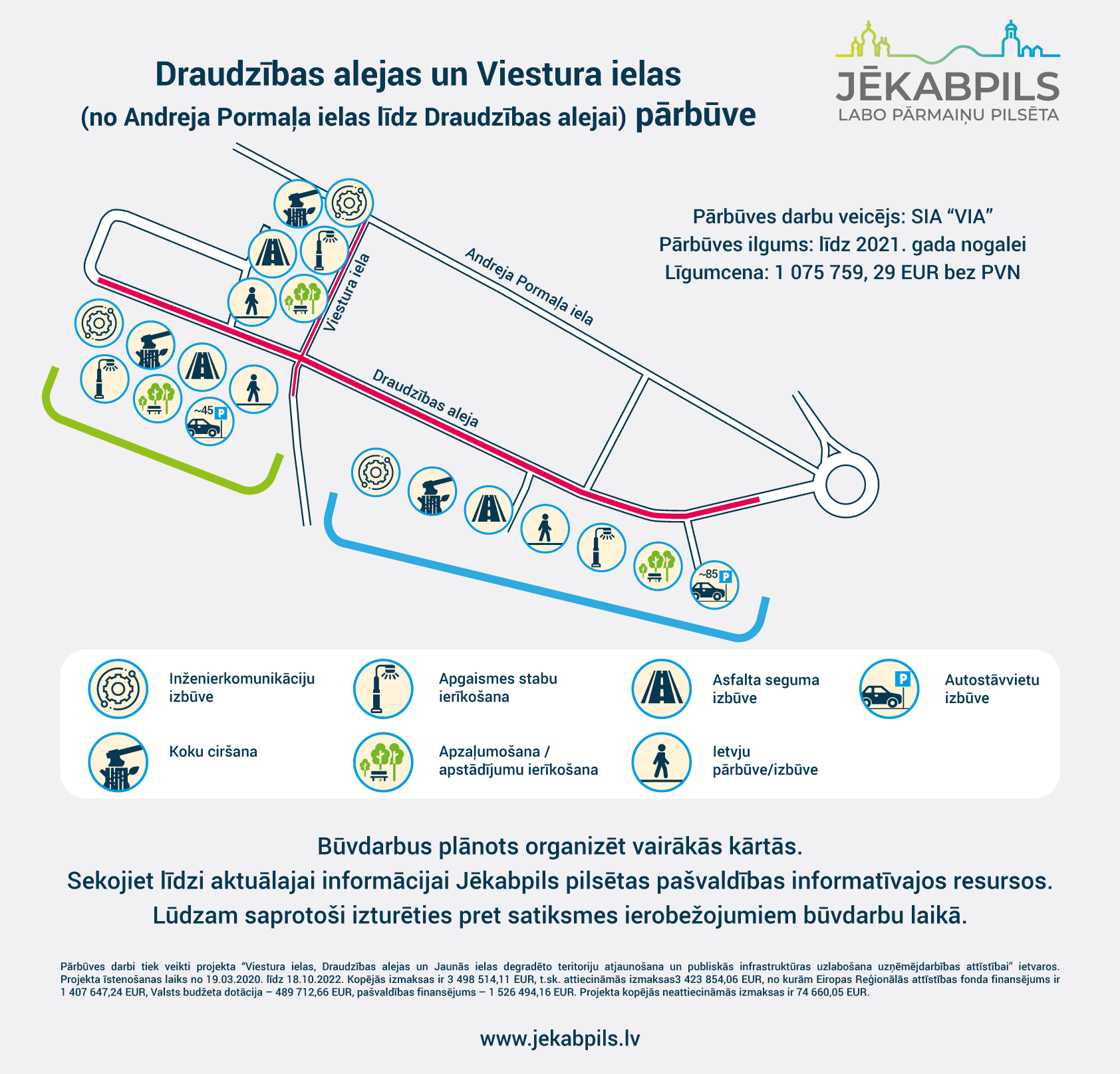Informācijai: Pārbūve Draudzības alejā un Viestura ielas posmā notiek projekta “Viestura ielas, Draudzības alejas un Jaunās ielas degradēto teritoriju atjaunošana un publiskās infrastruktūras uzlabošana uzņēmējdarbības attīstībai” (Nr. 5.6.2.0/18/I/020) ietvaros.