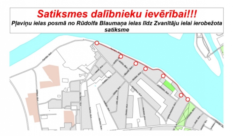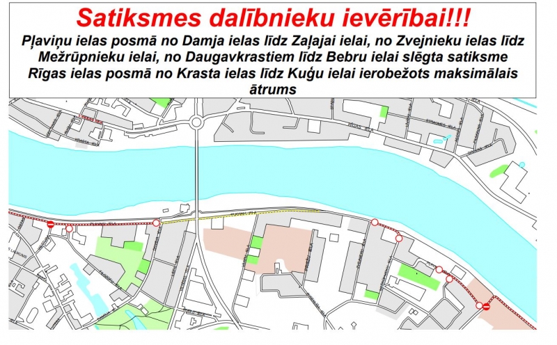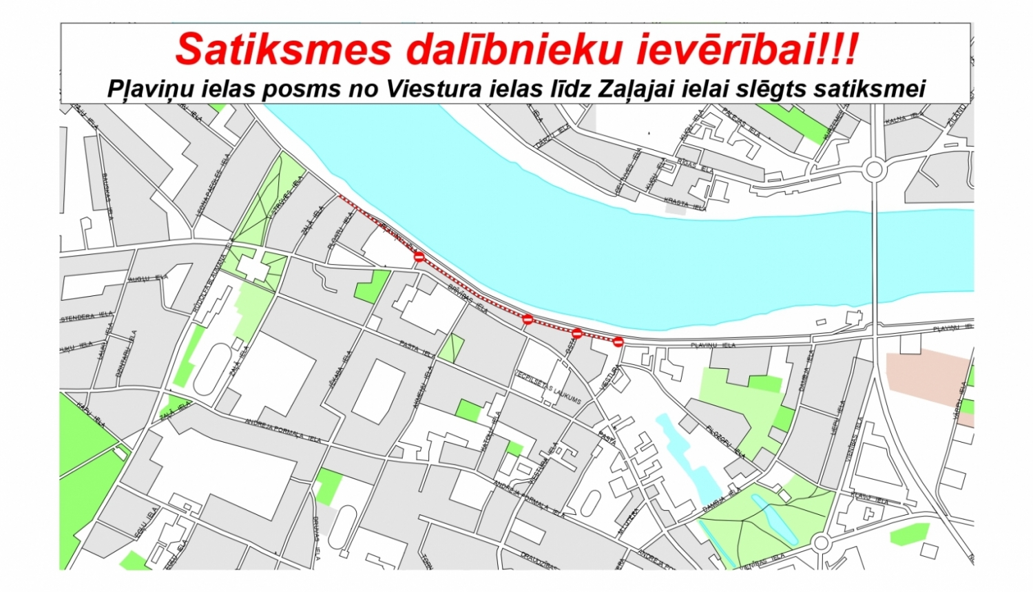Pļaviņu ielas posmā no Dambja ielas līdz Zaļajai ielai, no Zvejnieka ielas līdz Mežrūpnieku ielai, no Daugavkrastiem līdz Bebru ielai slēgta satiksme.
