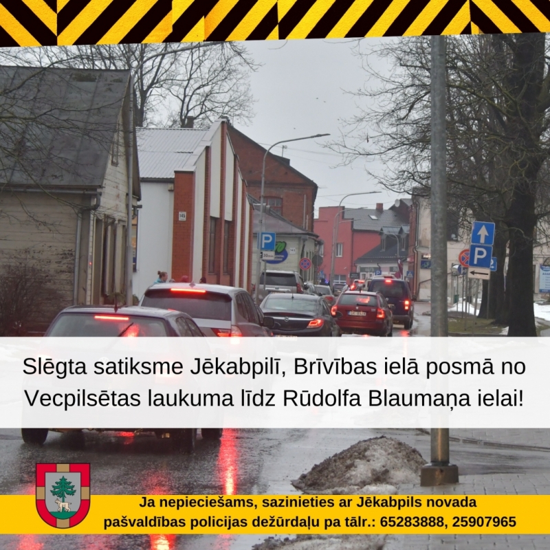 Slēgta satiksme Jēkabpilī, Brīvības ielā posmā no Vecpilsētas laukuma līdz Rūdolfa Blaumaņa ielai!