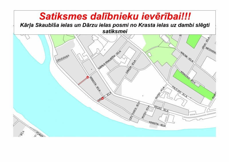 Kārļa Skaubīša ielas un Dārzu ielas posmi no Krasta ielas uz dambi ir slēgti satiksmei!