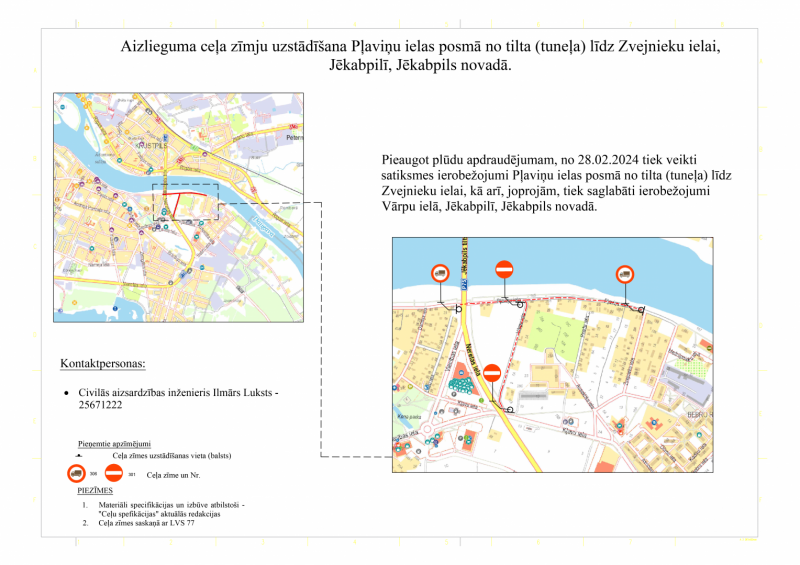 Pieaugot plūdu apdraudējumam, no 28.02.2024 tiek veikti satiksmes ierobežojumi Jēkabpilī, Pļaviņu ielas posmā no tilta (tuneļa) līdz Zvejnieku ielai, kā arī, joprojām, tiek saglabāti ierobežojumi Vārpu ielā Jēkabpilī.