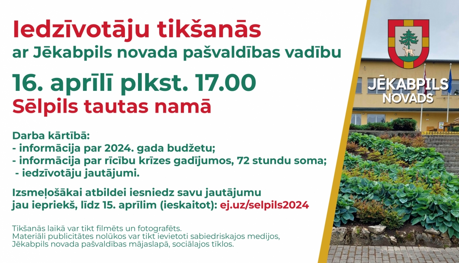 Informējam, ka tikšanās laikā var tikt filmēts un fotografēts. Materiāli publicitātes nolūkos var tikt ievietoti sabiedriskajos medijos, Jēkabpils novada pašvaldības mājaslapā, sociālajos tīklos.