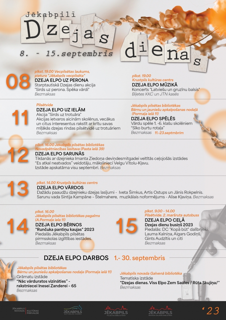 Jēkabpilī Dzejas dienas atzīmēsim no 8. līdz 15. septembrim ar devīzi “Dzeja elpo”. Dzeja ir katrā no mums, uz ielām, mūzikā, vārdos, darbos. Dzeja ir ceļā un sarunās. Dzeja elpo it visur!