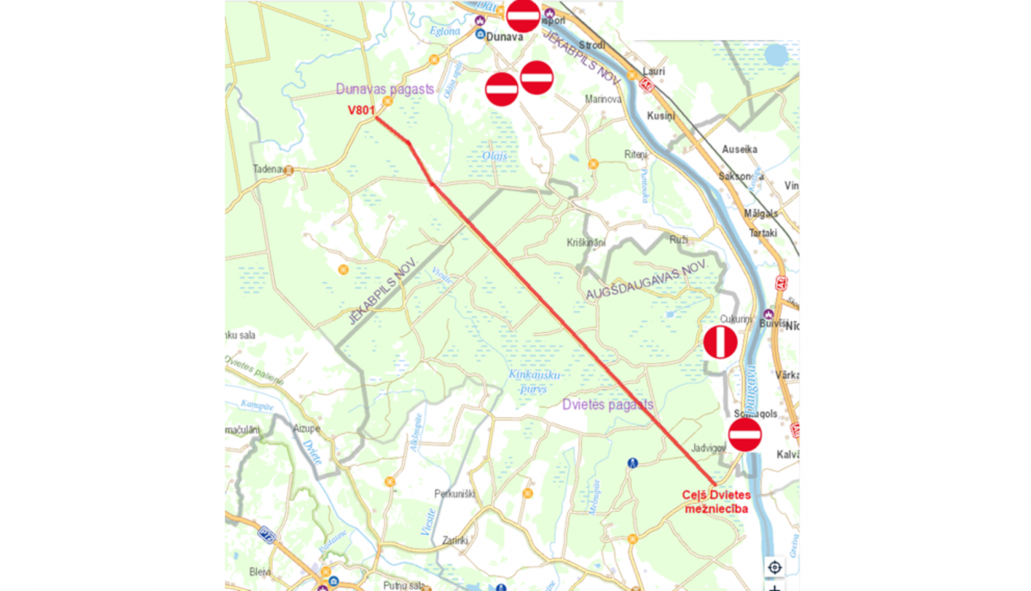 ! Apbraukt slēgto posmu iespējams pa a/c Ilūkste (Virsaiši)–Bebrene–Birži (P72) un Rubeņi–Dunava (V801).