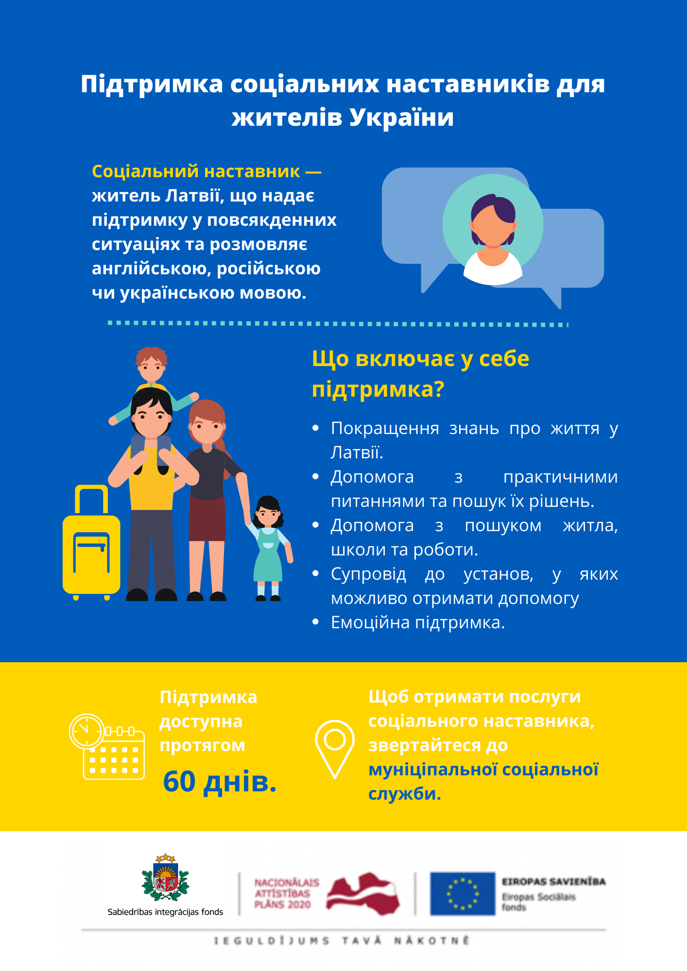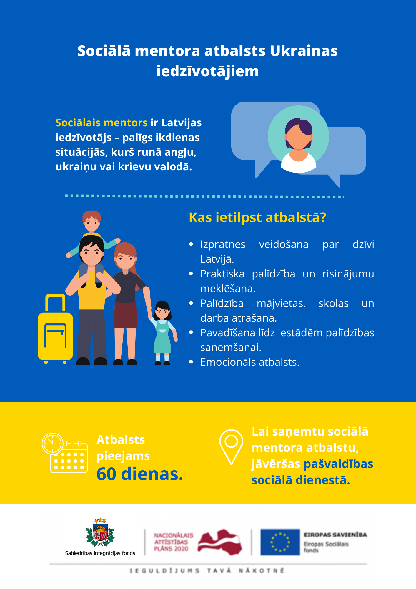 Lai pēc iespējas operatīvāk sniegtu atbalstu Ukrainas iedzīvotājiem, kas kara rezultātā nokļuvuši Latvijā, SIF sadarbībā ar Labklājības ministriju ir izveidojis jaunu atbalsta pakalpojumu. Lai saņemtu sociālā mentora pakalpojumu, Ukrainas iedzīvotājiem ir jāvēršas pašvaldības sociālajā dienestā. Sociālo dienestu sociālie darbinieki izvērtēs katra klienta individuālo gadījumu, un nepieciešamības gadījumā piesaistīs SIF nodrošinātu sociālo mentoru.