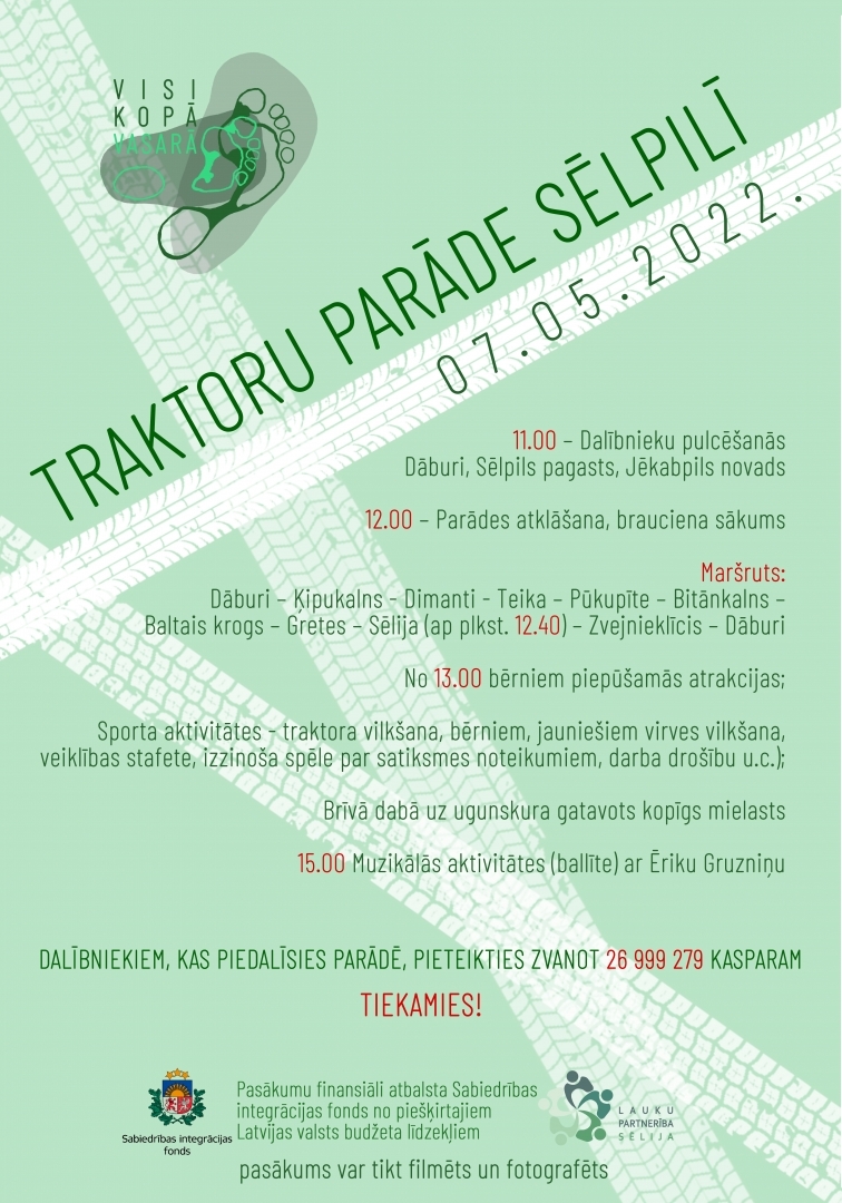 Sadarbojoties ar nevalstiskajām organizācijām Jēkabpils novadā, biedrība “Lauku partnerība Sēlija” ir uzsākusi īstenot projektu “Visi kopā vasarā!” Projekta ietvaros visas vasaras garumā Jēkabpils novadā notiks dažādas aktivitātes ģimenēm ar bērniem. Jau 7.maijā biedrība “Esparsete” aicina uz Traktoru parādi Sēlpilī. Projektu finansiāli atbalsta Sabiedrības integrācijas fonds no piešķirtajiem Latvijas valsts budžeta līdzekļiem.