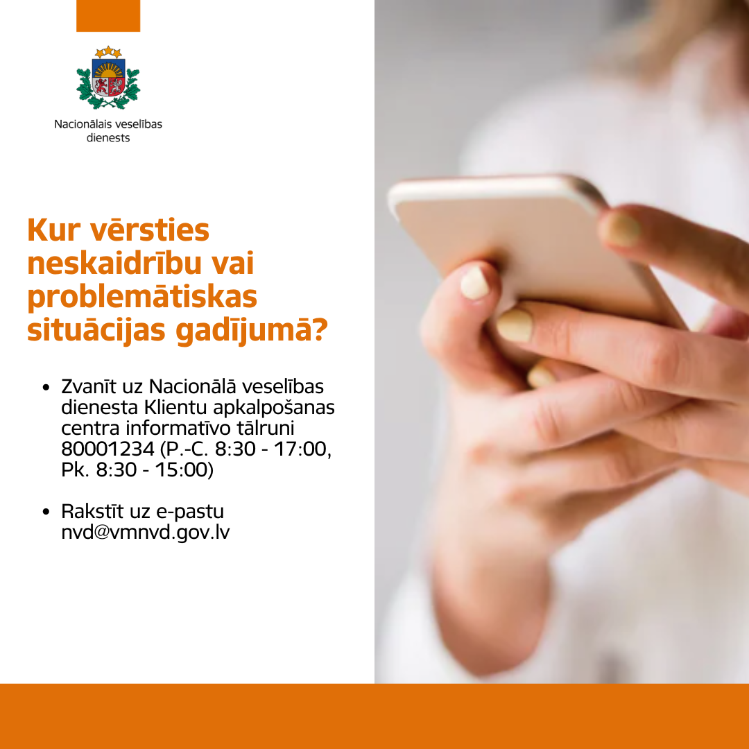 Neskaidrību vai problēmsituāciju gadījumos, kas var rasties pakalpojuma pieteikšanas vai saņemšanas procesā, NVD aicina sazināties ar Klientu apkalpošanas centru, zvanot uz bezmaksas informatīvo tālruni 80001234 (darba laiks: pirmdienās - ceturtdienās plkst. 8.30 - 17:00, piektdienās plkst. 8:30 - 15:00) vai rakstot uz e-pastu nvd@vmnvd.gov.lv.