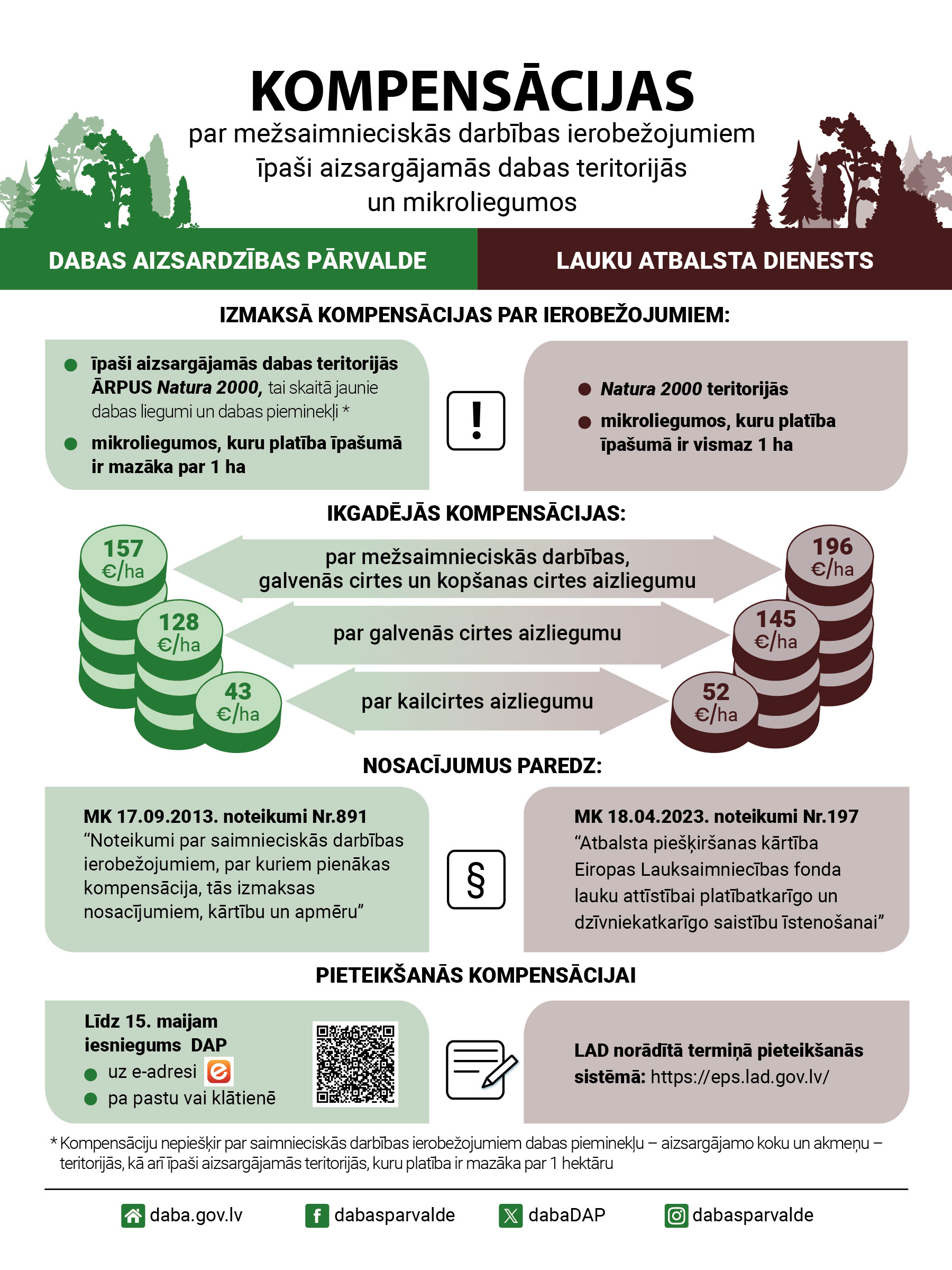Pārvalde atgādina, ka ikgadējās kompensācijas Natura 2000 tīkla teritorijās un mikroliegumos, kuru platība īpašumā ir vismaz 1 ha, izmaksā Lauku atbalsta dienests (LAD). Šīm kompensācijām jāpiesakās, aizpildot vienoto iesniegumu LAD Elektroniskajā pieteikšanās sistēmā LAD noteiktajā kārtībā un termiņā.