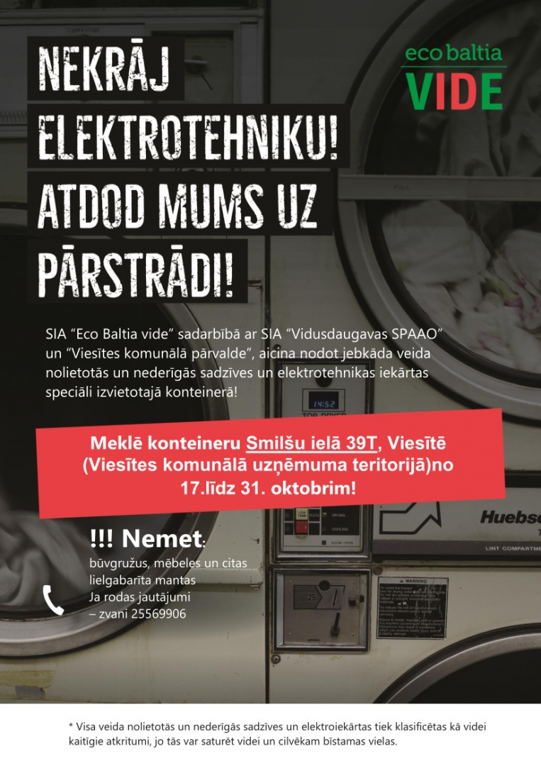 Lai veicinātu, ka ikvienam Latvijas iedzīvotājam ir iespēja no nolietotās un vairs nederīgās elektronikas atbrīvoties videi draudzīgā veidā, vides apsaimniekošanas uzņēmums SIA „Eco Baltia vide” sadarbībā ar SIA „Vidusdaugavas SPAAO” un SIA „Viesītes komunālā pārvalde” aicina Viesītes reģiona iedzīvotājus līdz 31. oktobrim nogādāt nolietoto un vairs nevajadzīgo elektroiekārtu uz speciāli izveidotu šķirošanas punktu Smilšu ielā 39T, Viesītē.