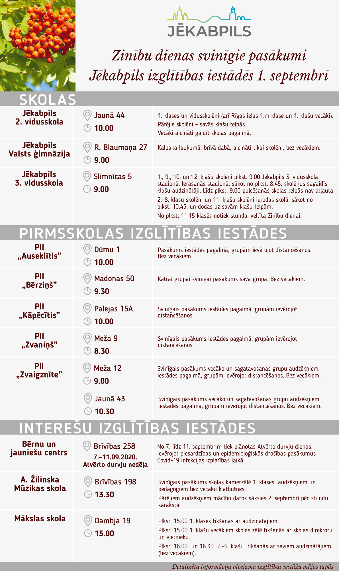 1.,9.,10. un 12.klašu skolēni plkst. 9.00 Jēkabpils 3.vidusskola stadionā. Ierašanās stadionā sākot no plkst. 8.45, kur skolēnus sagaidīs klašu audzinātāji. Līdz plkst. 9.00 pulcēšanās skolas telpās nav atļauta. 2.-8.klašu skolēni un 11.klašu skolēni ierodas skolā sākot no 10.45. un dodas uz savām klašu telpām. No 11.15 klasēs notiek stunda veltīta Zinību dienai. |