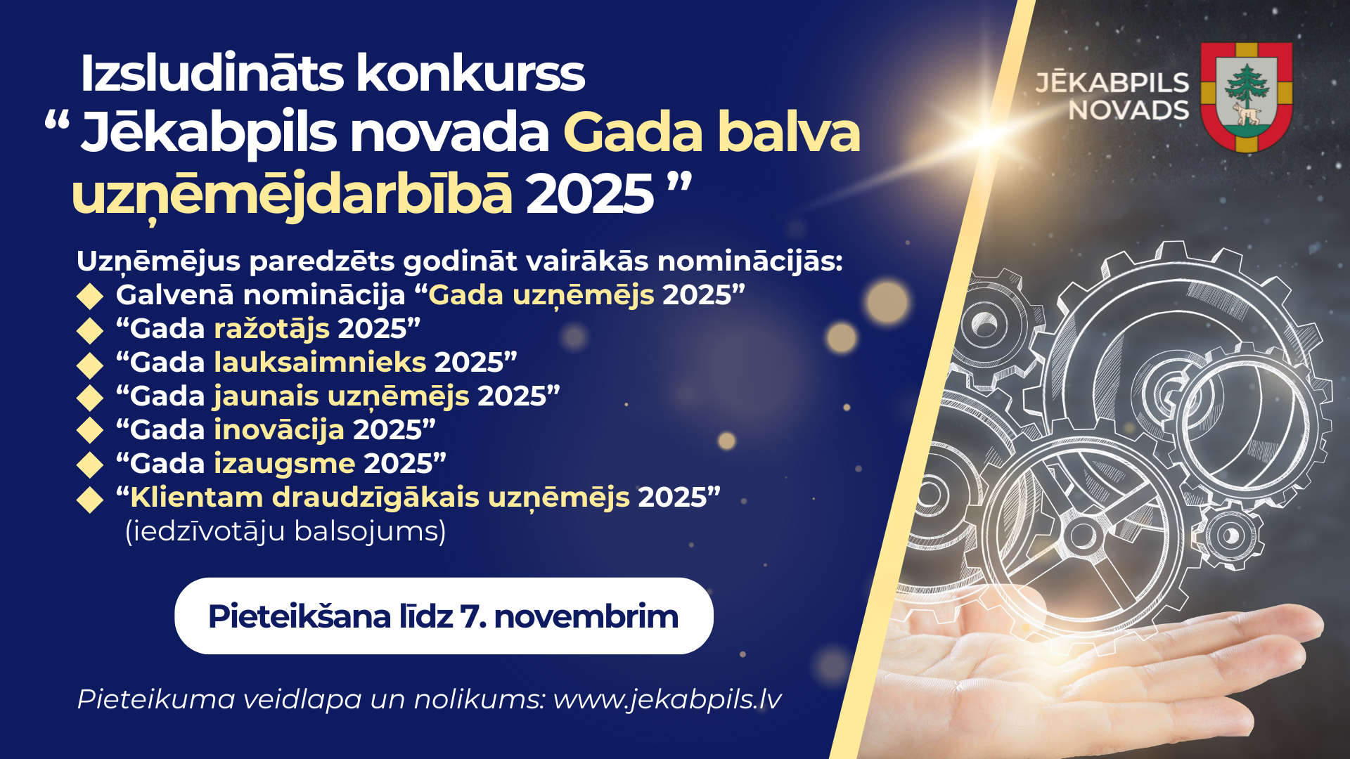 Lai godinātu uzņēmēju darbu un popularizētu to devumu novadam, Jēkabpils novada pašvaldība izsludina konkursu “Jēkabpils novada Gada balva uzņēmējdarbībā 2025”.