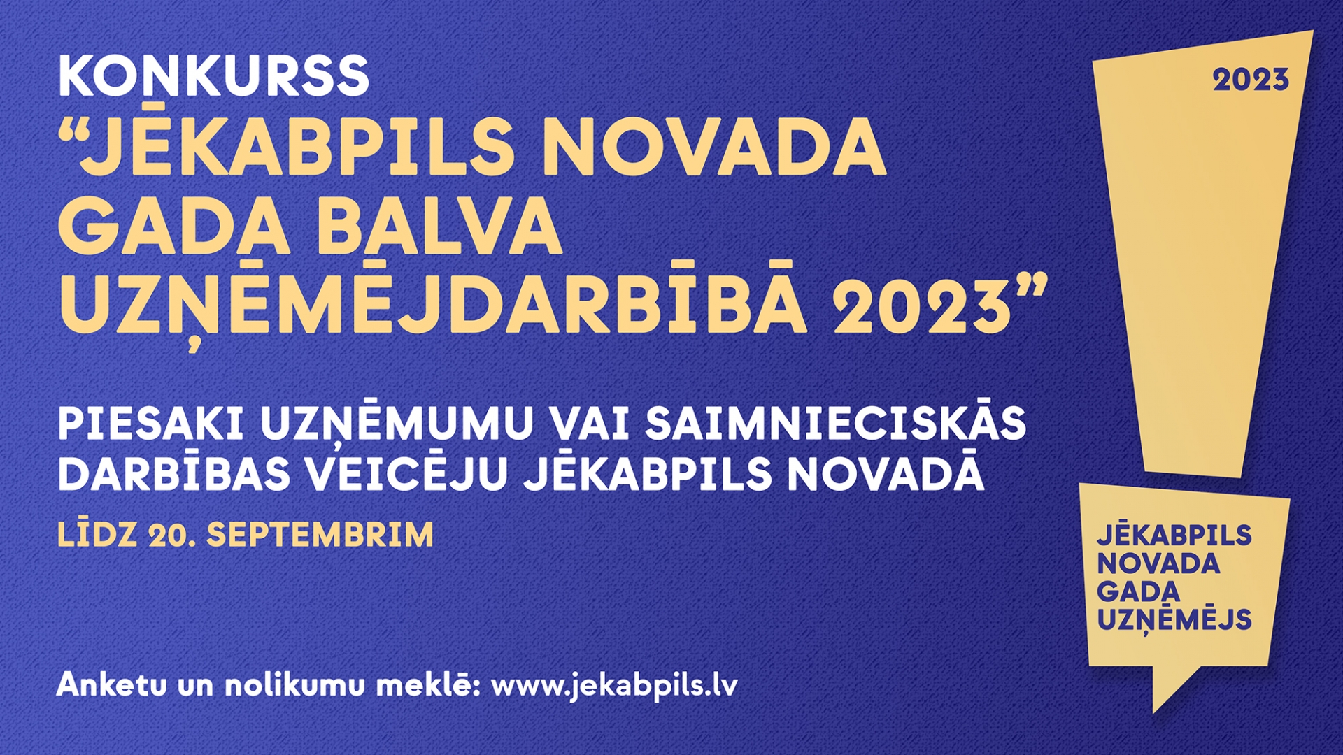 Lai godinātu uzņēmēju darbu un popularizētu to devumu novadam, Jēkabpils novada pašvaldība izsludina konkursu “Jēkabpils novada Gada balva uzņēmējdarbībā 2023”.