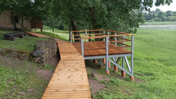 Sasniedzamais rezultāts: koka dēļu klājuma taka ar platformu pie Marinzejas ezera.