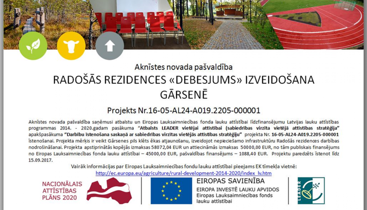 LEADER programmas atbalstīts apakšpasākuma 19.2 „Darbības īstenošana saskaņā ar sabiedrības virzītas vietējās attīstības stratēģiju” aktivitātes 19.2.2. „Vietas potenciāla attīstības iniciatīvas” 8.rīcība „Radošās rezidences” projekts  „Radošās rezidences „Debesjums” izveidošana Gārsenē”, projekta Nr. 16-05-AL24-A019.2205-000001, kura galvenais mērķis ir veikt Gārsenes pils klēts ēkas atjaunošanu, izveidojot nepieciešamo infrastruktūru Radošās rezidences darbības nodrošināšanai. Projekta kopējās izmaksas 58 072,04 EUR, no tiem publiskais finansējums 45 000,00 EUR, attiecināmās izmaksas 50 000,00 EUR, pašvaldības finansējums 13 000,00 EUR.