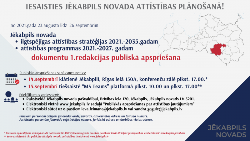 - sabiedriskās apspriedes laikā, kas notiks 2022. gada 9. novembrī, plkst. 11.00, Jēkabpils novada Attīstības pārvaldes konferenču zālē, 2. stāvā, Rīgas ielā 150A, Jēkabpilī. Klātienes apmeklējums iespējams saskaņā ar Ministru kabineta noteikumu Nr. 662 “Epidemioloģiskās drošības pasākumi Covid-19 infekcijas izplatības ierobežošanai” noteiktajām prasībām.