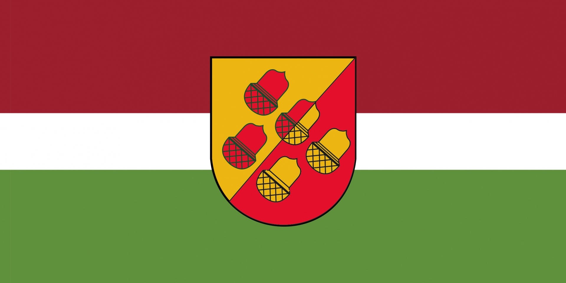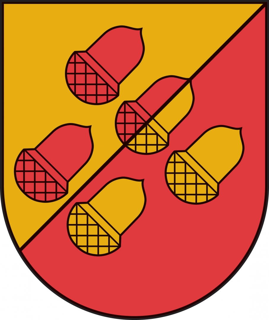 Ģerboņa apraksts: Šķelts no kreisās ar zeltu un sarkanu, kreisās spāres virzienā liktas piecas (3/2) ozolzīles – no viena uz otru.