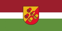 Taisnstūra audums ar divām dažāda platuma horizontālām joslām: augšējā josla ir karmīnsarkanā, apakšējā – baltā krāsā.