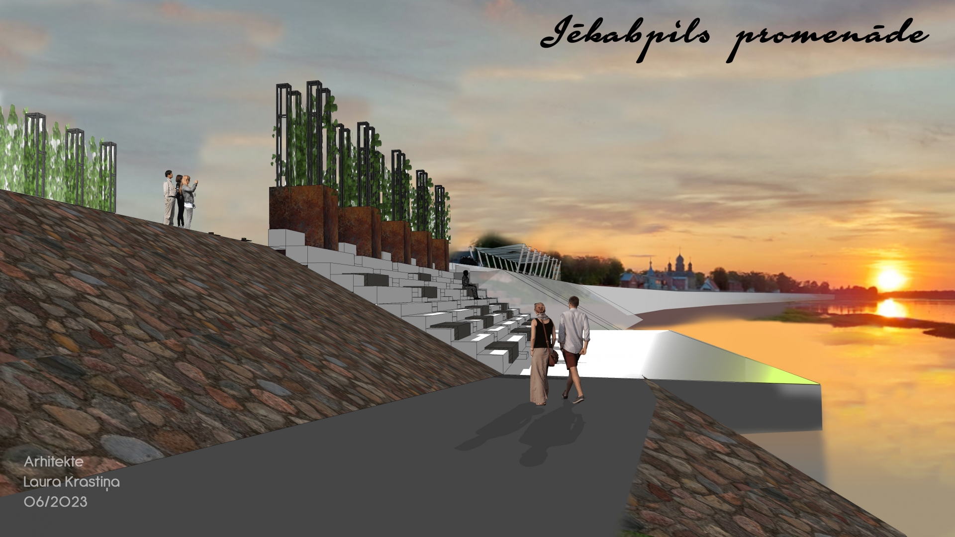 Lai aizsargdambis būtu ne tikai drošs, bet arī ilgtspējīgs, daudzveidīgs, "dzīvs" un, lai iedzīvotājiem pa to būtu patīkami pārvietoties, tiks veikta tā labiekārtošana - uzstādīti soliņi un  sēžamvirsmas, informatīvās norādes un stendi, margas, miskastes, veidotas apstādījumu zonas un izvietoti vides objekti. Tiks veikta esošo kāpņu pārbūve un papildus jaunu kāpņu izbūve, saglabājot un nodrošinot iedzīvotājiem ērtu piekļuvi gan aizsargdambim, gan upei. Paredzēta laipas izvietošana Daugavā, kā arī tiks labiekārtota teritorija pie centrālajām kāpnēm. Pie noejām pie Daugavas no aizsargdambja augšas tiks veidotas konstrukcijas, kur iedzīvotāji varēs pieslēgt savas laivas. Salaskroga ielas zonā uz aizsargdambja tiks izbūvēta dekoratīva konstrukcija – nojume. Tiks labiekārtota Arvīda Žilinska Jēkabpils mūzikas skolas pagalma daļa pret Pļaviņu ielu (uzstādīts vides objekts “Skatuve”, izvietoti velostatīvi, izbūvētas stāvvietas). Aizsargdambja pakājē pret mūzikas skolu paredzēta skatītāju zona - vecākiem, jaunajiem mūziķiem u.c. skatītājiem un klausītājiem.